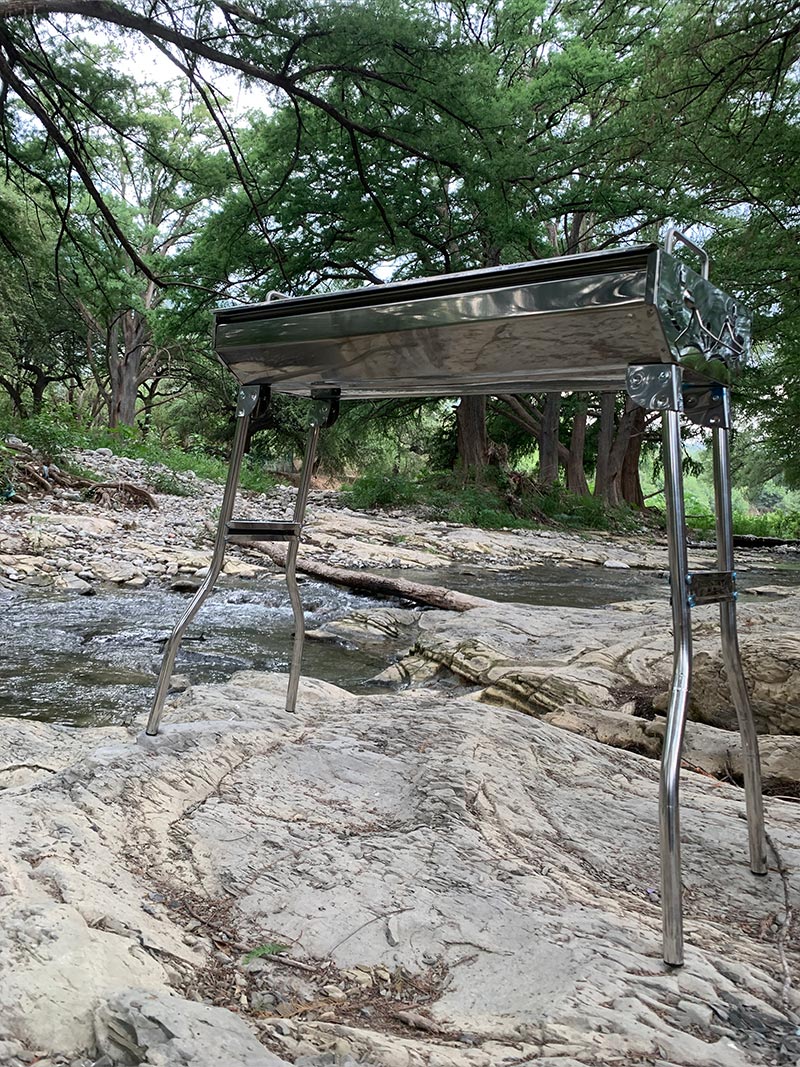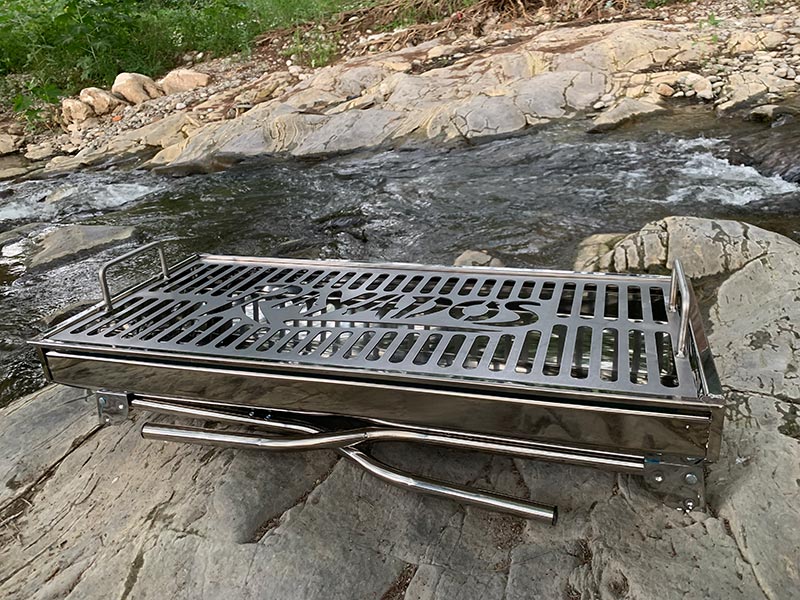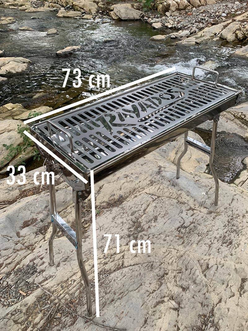 Fabricado en acero inoxidable anticorrosión, patas de bisagra plegable, parrilla desmontable. Medidas: 73 cm largo x 33 cm ancho. Edición limitada. Envíos locales y a todo el país.